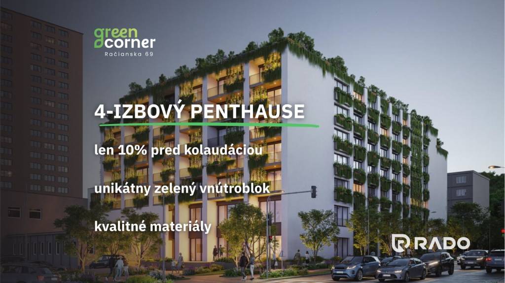 Luxusný 4-izbový penthouse s veľkou terasou a panoramatickým výhľadom – Green Corner, Račianska 69, Bratislava – Nové Mesto