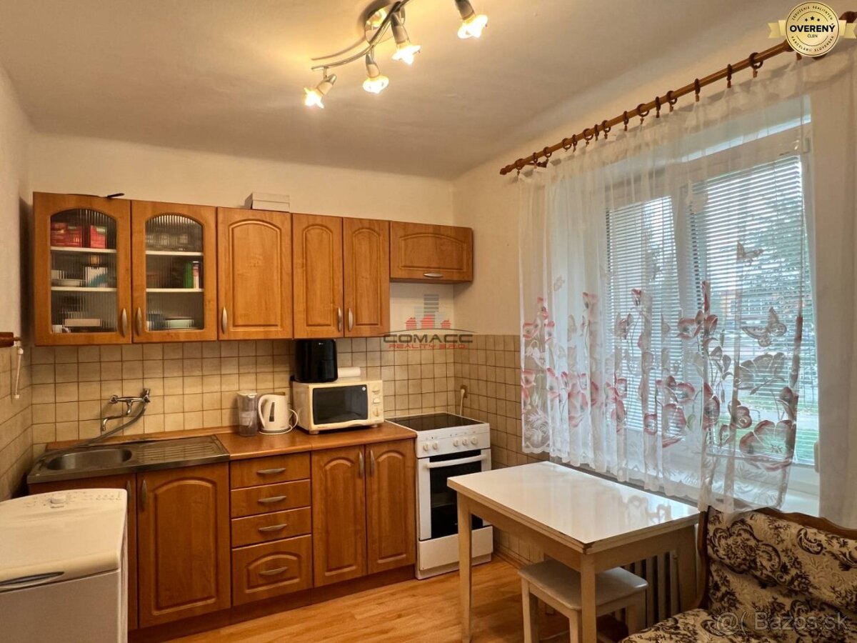 Byt pozostáva zo vstupnej chodby, kuchyne s jedálenskou častou, priestrannej izby, murovanej kúpeľne s WC a veľkej pivnice. V celom byte sú plastové okná s vnútornými žalúziami. Byt je vystierkovaný, vymaľovaný. Interiérové dvere sú posuvné. V izbe a v kuchyni je plávajúca podlaha, na chodbe, v kúpeľni a WC je dlažba. Kúpeľňa je vymurovaná s obkladmi, so sprchovým kútom, umývadlom so skrinkou, zrkadlom. Kuchyňa je vybavená kuchynskou linkou s pracovnou doskou so spotrebičmi - el. sporák, elektrická rúra. Chladnička s malou mrazničkou. Nereyový dres. V kuchyni sa nachádza aj kuchynský stôl a rohová lavica. V obývacej izbe/ spálni sa nachádza veľká manželská posteľ, skrine písací stolík, stoličky a komoda. Na chodbe je botník a vešiak. K bytu patrí veľká pivnica. Dobré parkovanie. Príjemní susedia. Cena prenájmu je 273,- Eur za nájom + 197,- Eur za plnenie. Spolu teda 470,- Eur / mesiac. Internet nie je v cene prenájmu, ale je k dispozícii. Poradenstvo, obhliadky a inzercia sú zdarma. Pri prenájme Vám zabezpečíme kompletný servis od obhliadok až po spracovanie zmlúv na prenájom nehnuteľnosti. Pre podrobné informácie volajte 0904 886241 prípadne píšte na mailovú adresu rabatinova@comaccreality.sk