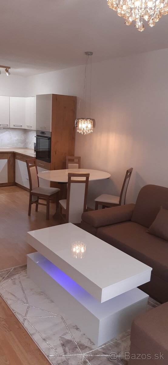 - V obývačke je rozkladacia sedačka, podsvietený konferenčný stôl, štýlový luster a veľké francúzske okná.