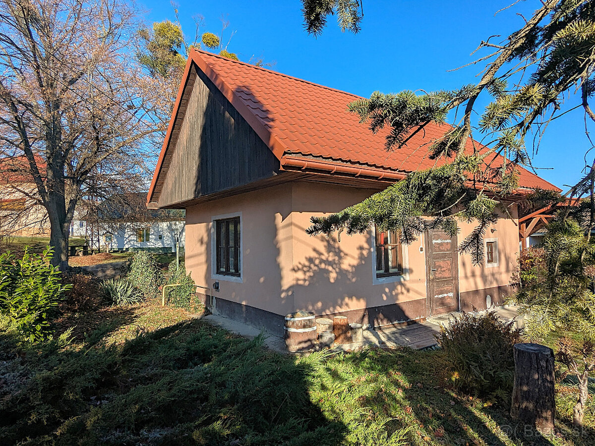 Druhá stavba, so škridlovou strechou, ukrýva dve priestranné miestnosti, kuchyňu a dielňu – ideálne miesto pre tvorenie, oddych či rodinné stretnutia.