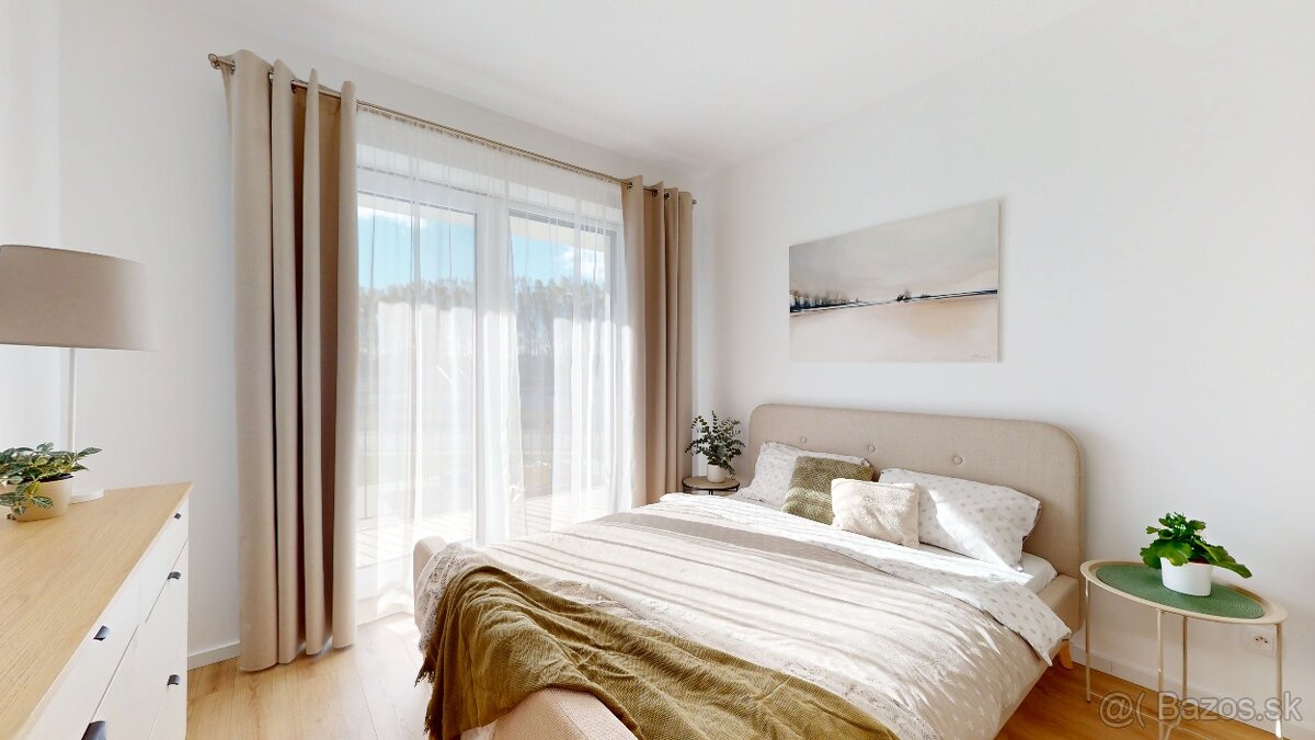 Dispozícia: priestranná vstupná chodba so vstavaným šatníkom, spálňa, samostatné WC, kúpeľňa s vaňou, nábytkom na mieru, obývacia izba spojená s kuchyňou.