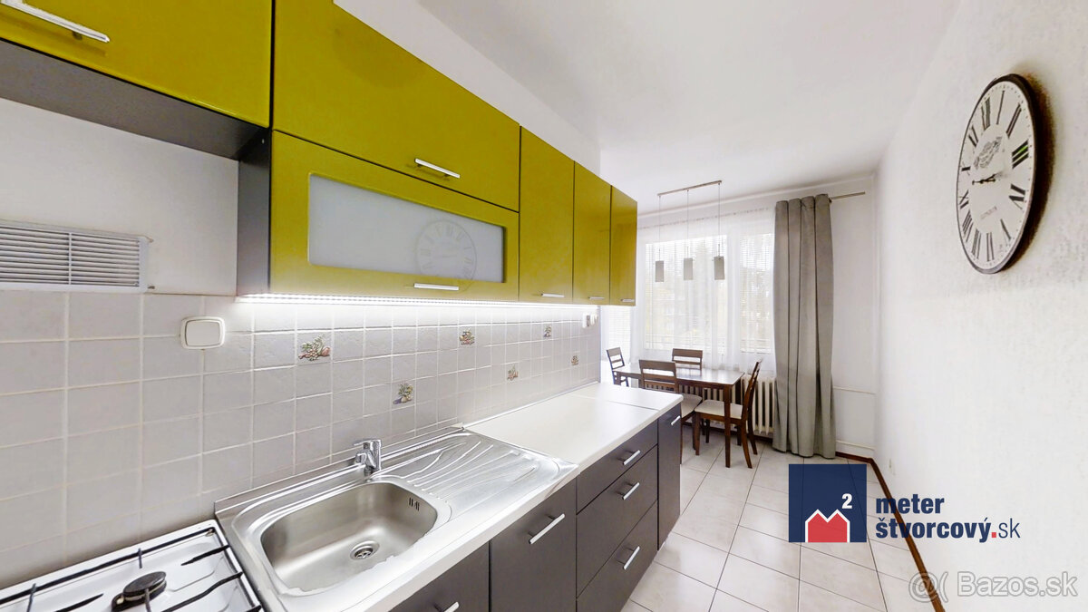 Byt prešiel vkusnou, aj keď staršou rekonštrukciou (plastové okná, nová elektroinštalácia, omietky, podlahy, kuchynská linka, kúpeľňa, interiérové dvere, bezpečnostné dvere Adlo). Predáva sa čiastočne zariadený, čo umožňuje novému majiteľovi dozariadiť si interiér podľa vlastných predstáv. V byte zostáva kuchynská linka, plynový sporák s el. rúrou, chladnička s mrazničkou, manželská posteľ, pc stolík so stoličkou, 2 šatníková skriňa, vstavaná skriňa v chodbe, komoda, sedacia súprava s kreslom, obývacia stena, jedálenský stôl so stoličkami, a v kúpeľni práčka so sušičkou.