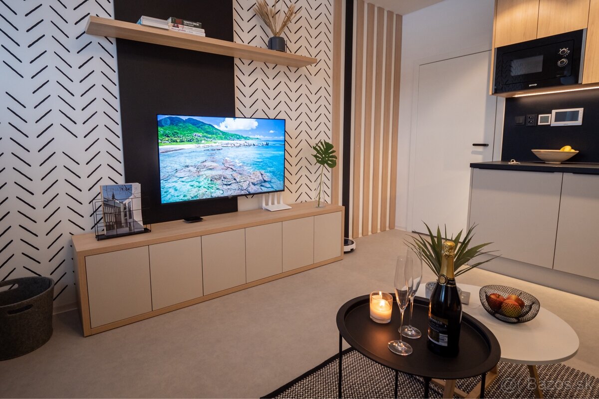 Priestor je kompletne zariadený nábytkom na mieru. Kuchynská linka má chladničku, indukčnú dosku, mikrovlnku, umývačku riadu, práčku a kanvicu. Zabudované skrine poskytujú úložný priestor na dokumenty a prístroje. Technické vybavenie: videovrátnik, exteriérové žalúzie a sieťky, podlahové a stropné vykurovanie, smart TV, smart zrkadlo, stmievače svetla, nočné orientačné svetlá a optický internet. V cene nájomného je 1 parkovacie miesto v uzavretom komplexe a samostatný bezbariérový vstup.