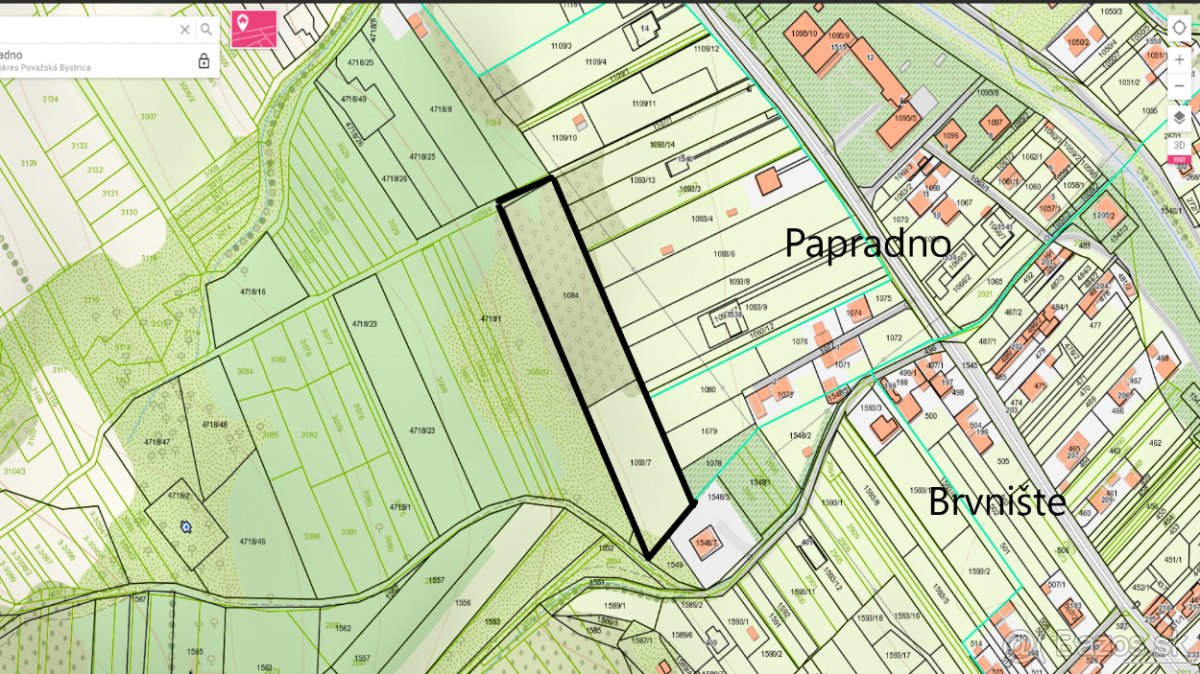 Predám stavebné pozemky typu C v intraviláne hneď na začiatku obce Papradno o rozlohe 7372m2, rozmery pozemku cca 36x200m, aktuálne už rozdelený na menšie časti po cca 600m2 ako je vyobrazené na fotke.