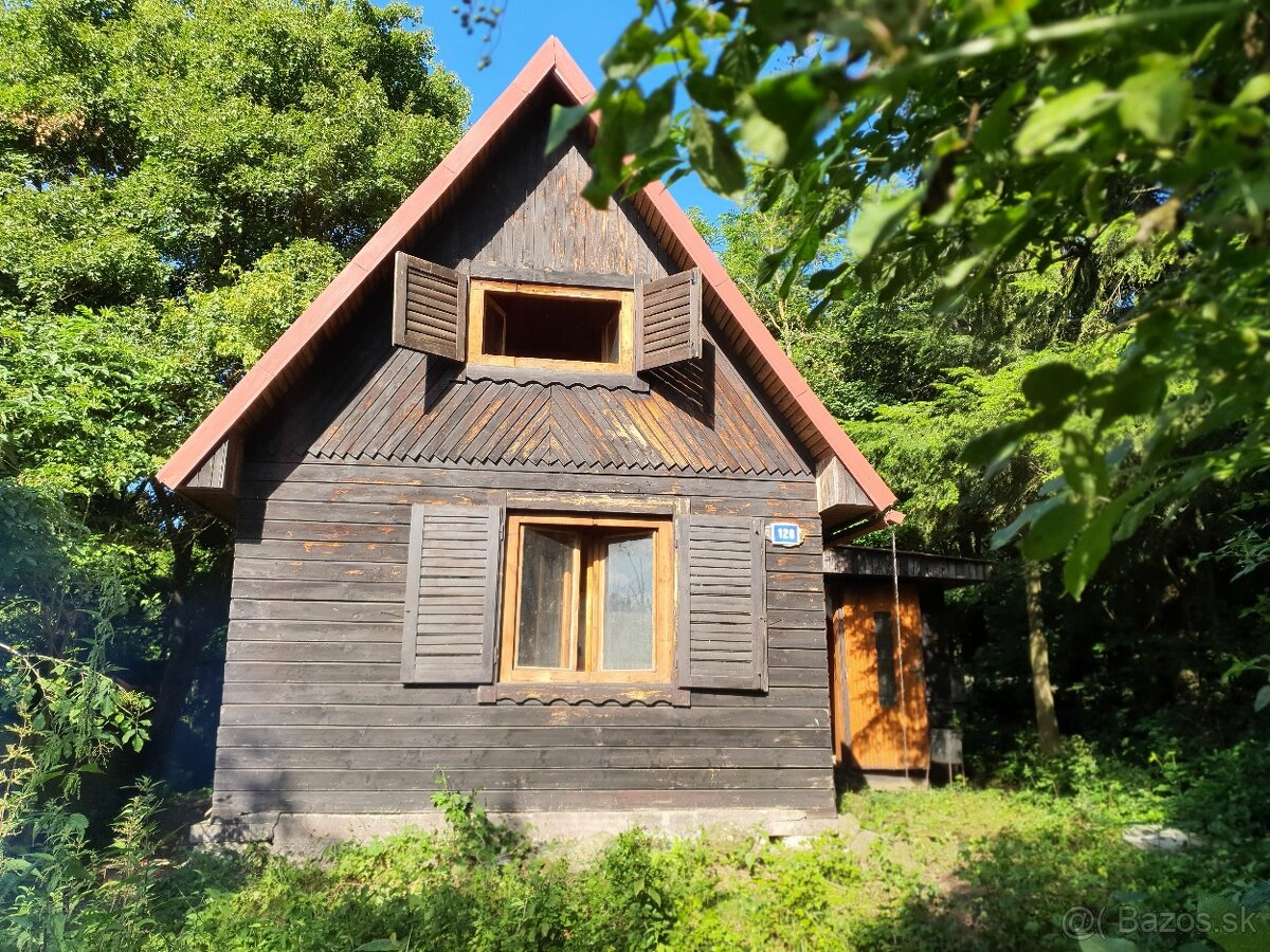 Zrubová chata s prístavbou.Interiér z červeného smreku, situovaná medzi stromami v okrajovej časti Meroviec.