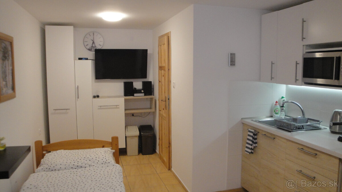 Prenajmem kompletne zariadenú garsónku 4km od Žilina, 1km od KIA. Garsónka je situovaná v prístavbe RD so samostatným vstupom. Výbava: Vybavená kuchynská linka, postel, prikrývky, obliečky, stôl, stoličky, skrinky, chotbová zostava, varna doska, chladnička, mikrovlnná rúra, var. kanvica, kávovar, TV smart, rádio, WIFI, vysávač, k dispozícií práčka so sušičkou.