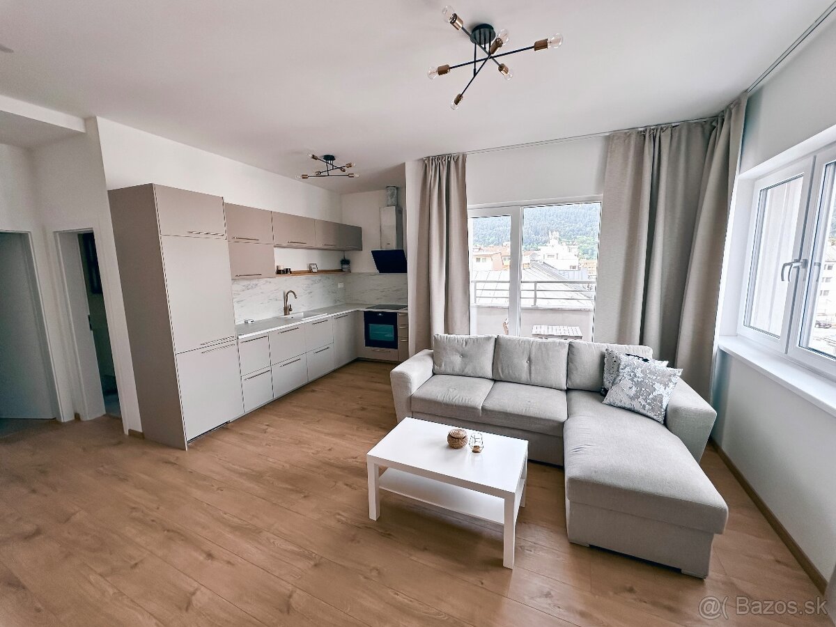 Súčasťou bytu je nová kuchyňa spojená s jedálňou a obývačkou, samostatná spálňa, oddelené WC, kúpeľňa so sprchovým kútom a práčkou, a malá odkladacia miestnosť. Z obývacej časti je vstup na balkón s orientáciou S/V a s výhľadom na Malú Fatru. Orientácia bytu - obývačka a spálňa je J/V.