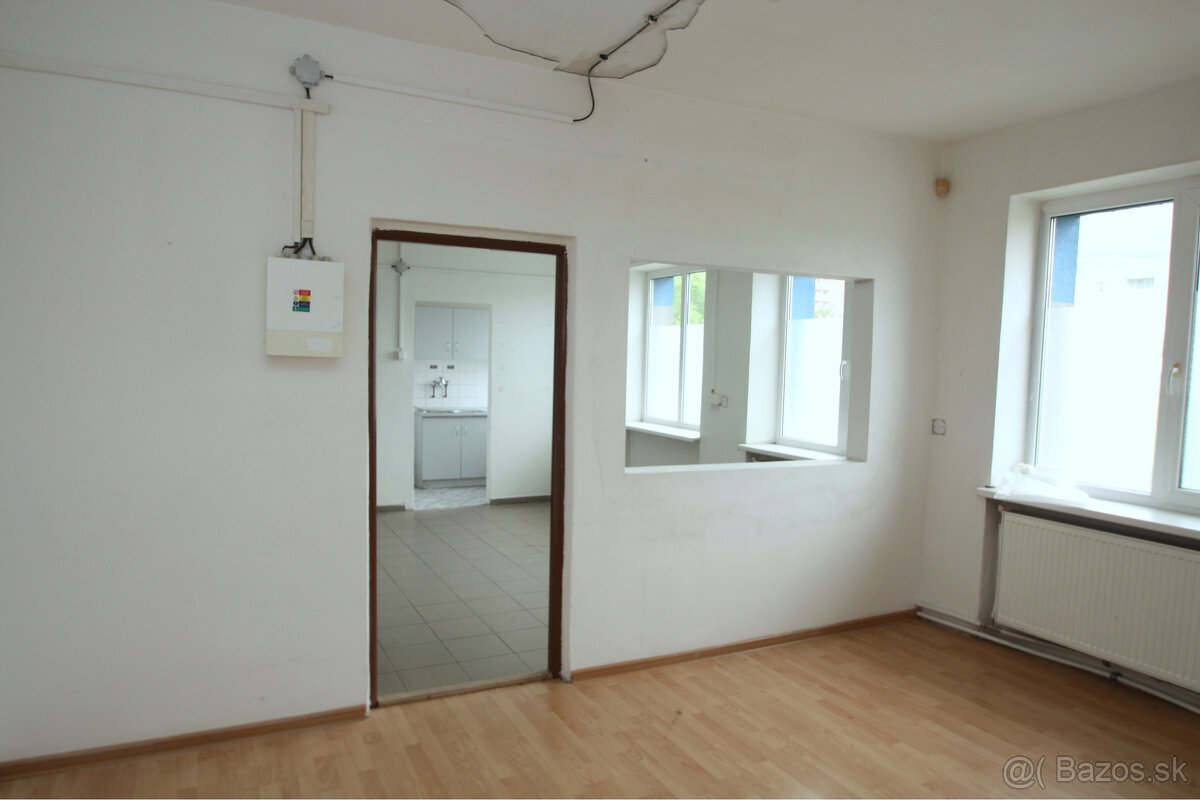 Priestor je vhodný ako výrobný, kancelársky, skladový. Nachádza sa tu elektrina 230/400 V. Priestor sa nachádza v prízemí, skladá sa z hlavnej miestnosti, priechodnej o výmere cca 4 x 4, samostatnej miestnosti 4 x 3,2 a kuchynky. WC je spoločné na chodbe.