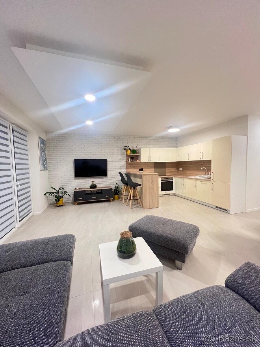 Moderná kuchynská linka je vybavená vstavanými spotrebičmi, praktickým barovým pultom a dostatkom úložného aj pracovného priestoru. Celý priestor pôsobí príjemne, otvorene a funkčne.