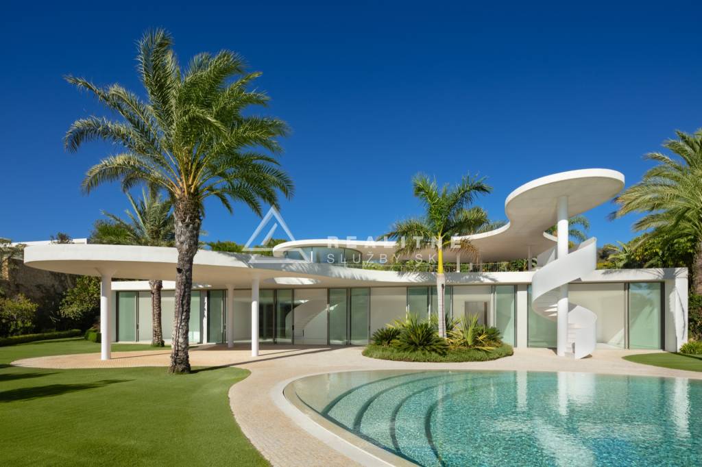 Táto prestížna vila je dôkazom architektonického dôvtipu, ktorý vystihuje podstatu jedinečnosti a sofistikovanosti. Futuristická, no zároveň nostalgická štruktúra, ktorú navrhli vizionári z architektonickej kancelárie Vicens & Ramos, púta pozornosť svojimi plynulými líniami a harmonickým začlenením do sviežej zelene. Vila harmonicky koexistuje s prírodou, obklopená tapisériou živej zelene. Na prízemí sa nachádzajú všetky obytné priestory, zatiaľ čo na hornom podlaží sa nachádza podmanivý kupolovitý vstup a na mieru vyrobené točité schodisko, ktoré navodzuje pocit veľkoleposti. Vchod, premyslene navrhnutý pre pohodlné parkovanie, vytvára scénu na privítanie hostí a zanechanie trvalého dojmu. Vonkajšie točité schodisko poskytuje priamy prístup do záhrady z úrovne vstupu. Prízemie zahŕňa plne vybavenú kuchyňu, veľkorysé obývacie a jedálenské priestory a štyri úžasné spálne, z ktorých každá ponúka svoje vlastné jedinečné čaro. Vďaka množstvu okien a sklenených posuvných dverí zaplavuje interiér prirodzené svetlo, ktoré ho plynulo spája s vonkajším prostredím. Vila sa môže pochváliť podmanivou záhradou, ktorú zvýrazňuje bazén v tvare vajíčka zdobený pokojnými svetlomodrými dlaždicami. Krajinu zdobia vysoké palmy, zatiaľ čo zelený trávnik poskytuje dostatok priestoru na trávenie voľného času a spoločenské stretnutia. Dlažba na terase, špeciálne vybraná pre túto nehnuteľnosť, dodáva vile ďalší osobitý charakter. Táto výnimočná vila, ktorá ponúka jedinečné architektonické dielo, je prísľubom výnimočného osobného útočiska, ktoré dopĺňa úchvatný výhľad a závideniahodná poloha v rámci uznávaného rezortu Finca Cortesin.