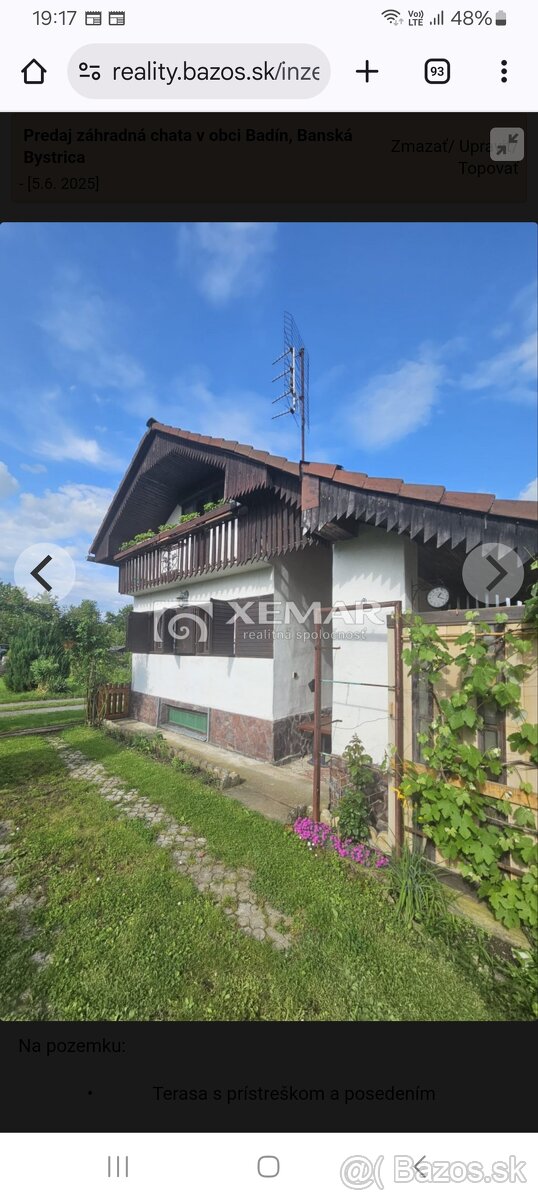 Predaj záhradnu chatu blizko Badinskeho jazera.Pozemok slnečný 550štvorcov.Na pozemku poschodova chata s prístavbami.predáva sa vybavením.Výhodou je vlastná studňa pitná voda je blískosti.
