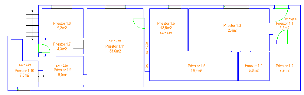 Objekt je rozdelený na 2 časti, pravá časť má 82m2 a ľavá 64m2.
