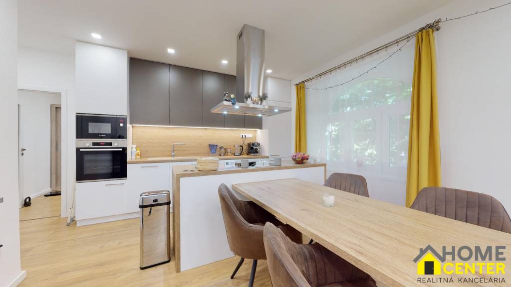 Ponúkame na predaj veľmi kvalitne zrekonštruovaný a krásne zariadený 3 izbový byt v Komárne. Tehlový byt vo výmere 94 m2 je situovaný na vyvýšenom prízemí. Samotná obytná budova sa nachádza na súkromnom pozemku vlastníkov bytov, v oplotenom dvore s parkovou úpravou a je obklopená zeleňou. Dispozične je byt riešený nasledovne – predizba, kuchyňa s jedálňou je spojená s obývacou časťou, 2 spálne, priestranná kúpeľňa /12m2/ s vaňou, so sprchovacím kútom, bidetom a toaletou, samostatná toaleta, technická miestnosť. Celková rekonštrukcia bytu bola dokončená v roku 2021 - nové inžinierske siete (elektrika, voda, plyn, kanalizácia), plastové okná (žalúzie, sieťky), klimatizácia, podlahové kúrenie, samostatné kúrenie a ohrev teplej vody, nové bezpečnostné a interiérové dvere so zárubňami, umývadlá so skrinkami, sprchovaci kút, vaňa, kuchynská linka so zabudovanými spotrebičmi - elektrická varná doska, elektrická rúra, umývačka, digestor, mikrovlnka, chladnička, v kúpeľni a WC dlažba, v ostatných častiach bytu drevená podlaha. Byt disponuje aj bezpečnostnou signalizáciou a prislúcha k nemu aj veľká pivnica s oknom, v ktorej sa dá vytvoriť pracovňa. Parkovanie je možné priamo pri obytnej budove, alebo vo dvore.