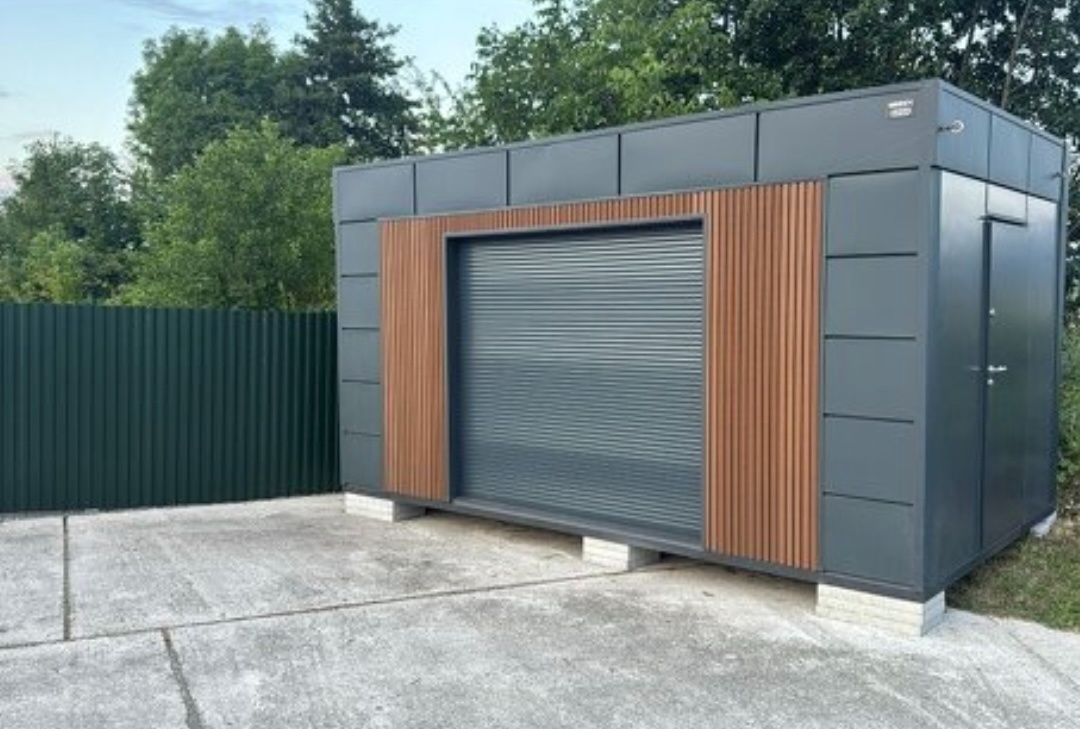 Rozmery: 5x3 m, z bočnej strany je vchod a z prednej strany je elektrická roleta.