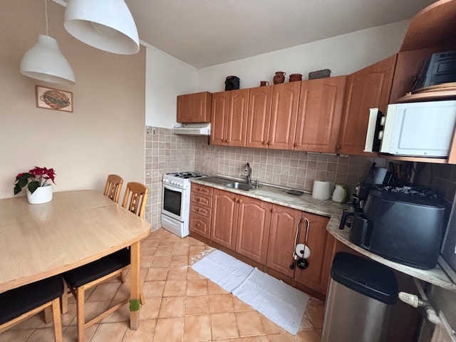 Byt ma priestrannú kuchyňu, ktorá poskytuje dostatok miesta na spoločné rodinné stolovanie aj každodenné fungovanie domácnosti.
