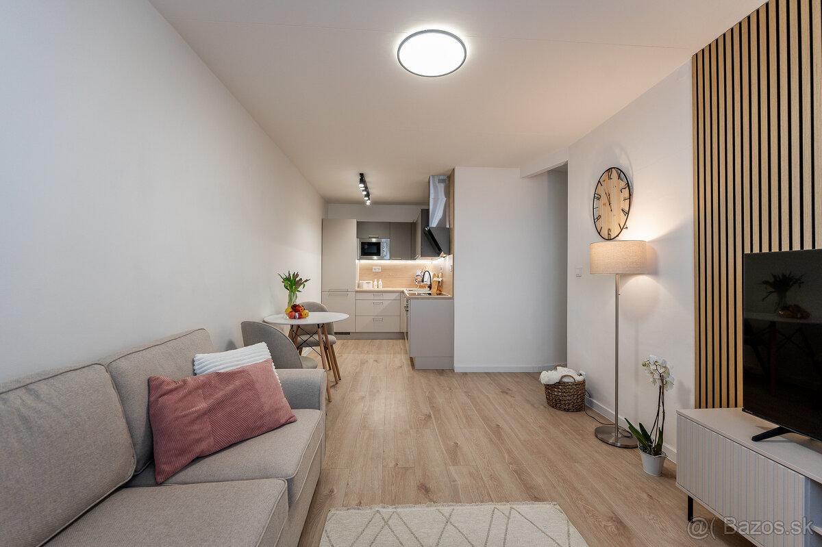 Tatiana Vrabelová z Reality s Vami vám predstavuje na prenájom úplne nový, elegantný a moderne zariadený 1,5-izbový byt po kompletnej rekonštrukcii, ktorý ešte nikto neužíval. Tento byt je ideálnou voľbou pre jednotlivca alebo pár, ktorí hľadajú komfortné a štýlové bývanie bez kompromisov a ocenia kvalitu, funkčnosť a čistý dizajn. Otvorený priestor kuchyne s obývacou izbou vytvára príjemnú atmosféru domova, spálňa s veľkou posteľou a pracovným kútikom ponúka pokoj aj priestor na oddych i prácu. Byt je kompletne zariadený, klimatizovaný a pripravený na okamžité nasťahovanie – stačí si priniesť osobné veci a začať nový príbeh v bývaní, ktoré vonia novotou a pohodlím.