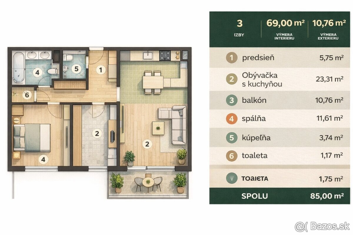 Byt disponuje premyslenou dispozíciou s celkovou výmerou 69 m² interiéru a veľkorysým balkónom o rozlohe 10,76 m², ktorý prirodzene rozširuje obytný priestor a ponúka priestor na relax. Celková plocha nehnuteľnosti predstavuje 85 m².